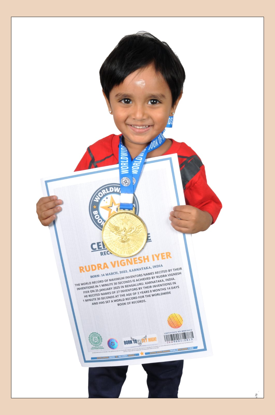 Bengaluru (Karnataka) [India], April 11: Prodigy Rudra Vignesh Iyer, born on March 14, 2022, has once again etched his name in history by achieving his third world record. On January 25, 2025, in Bengaluru, Karnataka, Rudra set the record for the “Maximum Inventors Named by Their Inventions in 1 Minute 30 Seconds.” At just 2 years, 8 months, and 14 days old, he accurately recited the names of 27 inventors based on their inventions within 90 seconds, earning him a place in the Worldwide Book of Records.